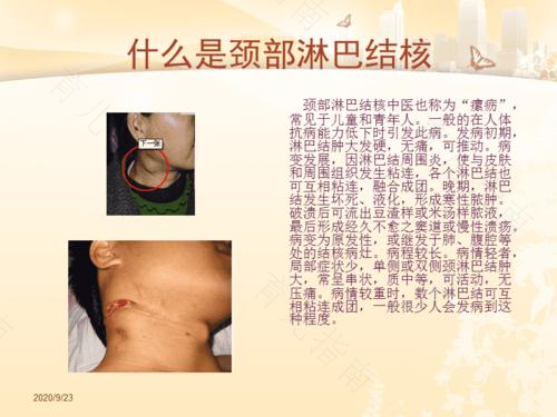 颈部淋巴结核是在脖子一边或是两边长出疙瘩,逐渐的长大,没有痛痒的症状,如果身体的抵抗力低的时候会逐渐的变大,导致皮肤发紫,最总会破溃流水样脓液或是比较干的脓液,有医生叫老鼠疮。少部分的人还有低热,盗汗,食欲不振,全身消瘦的症状。