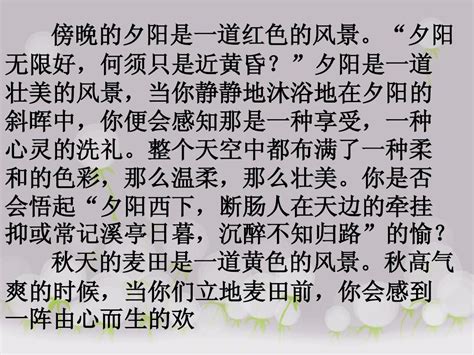 2、在晨曦里,在暮霭里,在田野里,在大山里,在城市里,在乡间的小路里,处处是人们的笑脸,处处是人们的身影,处处有着歌声,处处有着希望,处处有着幸福。