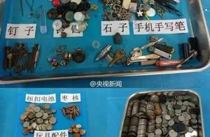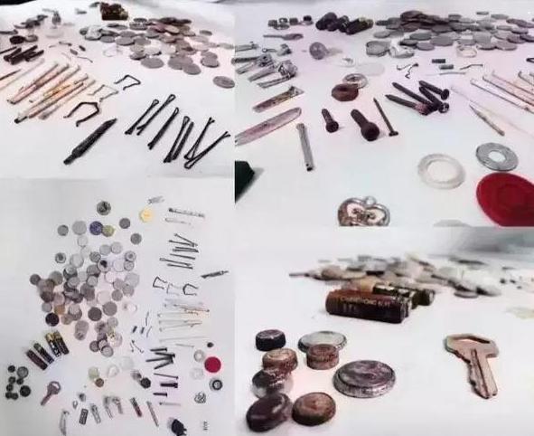 这里什么小玩意都有,有戒指、纽扣、石子、一些小玩具等,让人后怕的是,还有电池、钉子、缝衣针等危险物品,很难想象这些东西都是如何被孩子误吞的。其中最多的,是硬币,看到后只感到后怕。