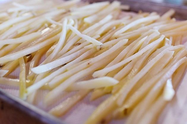 薯条虽说是油炸品,多吃对身体不太好,但是偶尔吃一次解解馋也未尝不可;薯条盐水浸泡可以加入少许底味;速冻约半个小时,土豆条似冻非冻即可,如果喜欢吃薯条的话,可以多冻一些薯条的半成品,吃的时候直接炸制即可;一定要小火慢炸,搅动时候力度不要过大。