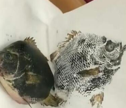 爷爷去到底去冰箱里拿了什么东西呢?原来,爷爷去冰箱里找到了昨天买的鱼,保鲜柜里的鱼还很新鲜。爷爷又从房间里拿来毛笔和墨汁,用毛笔蘸墨汁在鱼的身上轻轻刷上一层,墨汁稍微干了一点之后,紧接着拿了一张白纸,把蘸有墨汁的一面,放在白纸上,用手均匀按压之后,再把纸慢慢拿开,一条活灵活现的鱼,跃然纸上。