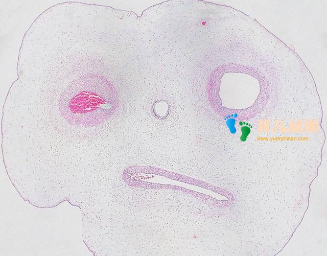 仅从人类角度讲,脐带就是连接胎盘和胎儿之间一根长约30cm~70cm的管状结构。脐带内有两条动脉,一条静脉,螺旋蜿蜒,长度不一,形态各异,看上去就像一根麻绳,横切面却呈现为一个『品』字。健康的脐带横切面如下图,是个笑脸。