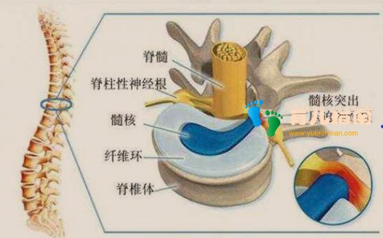 腰椎间盘突出就是在外力作用下,比如孕妇弯腰拿东西,普通人肩膀过度负重,发生挤压造成纤维环的松动,而一旦纤维环发生松动,髓核就发生移位刺激神经,这就是腰椎间盘突出症。