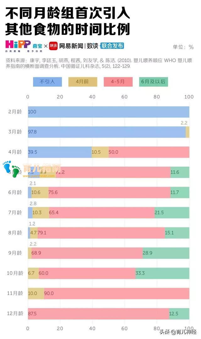 《中国循证儿科杂志》上发表的一篇研究显示,近7成的中国家长在孩子4-5个月大的时候就会添加辅食,但这样的做法,早在2001年世界卫生组织就不推荐了。[5][12]