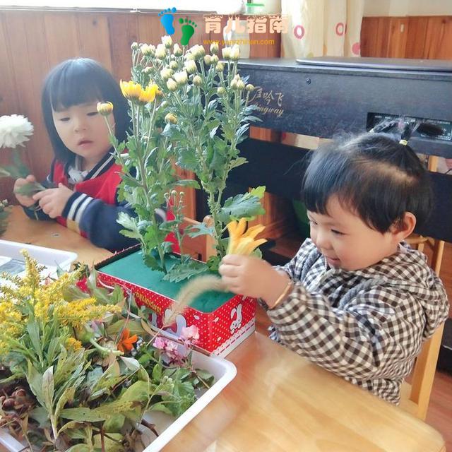 看,孩子们带来了各种各样的活动材料:田野里随处可见的狗尾巴草、色彩斑斓的小雏菊、庭院里的鸡冠花……他们一起合作、讨论,挑选出自己最喜欢的花朵插到花盆里,有的大,有的小,有的高,有的矮,有的密,有的疏,不一会儿,花盆里就放满了漂亮的花,孩子们也成为骄傲的小小插花师。