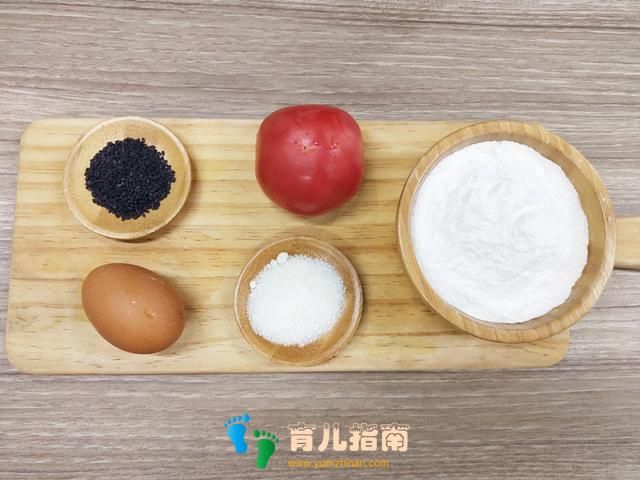 普通面粉 180克、西红柿 50克、糖 10克、黑芝麻 5克、鸡蛋 1个