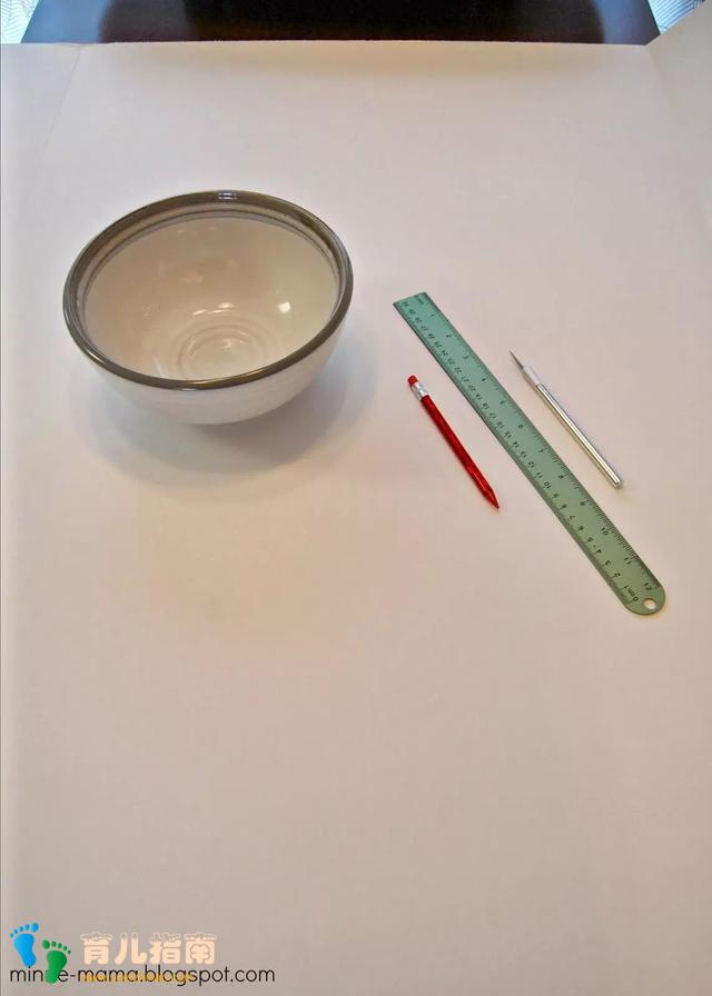 准备一个厚一点的背景板,至于是纸板还是泡沫板没有要求。准备2个大小不一的碗,一个手工刀,一把尺子,一支铅笔。颜料和白纸