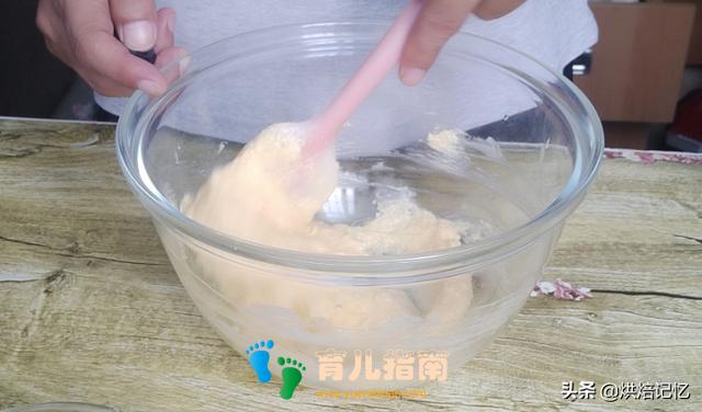6、如果我们在拌时,感觉材料已经产生弹性时,此部分工作就表面已经完成了。这时如果手酸,特别我们女性朋友就可以休息一下了,但前面的部分特别是加蛋后一定要一次做完,中间不要停顿。