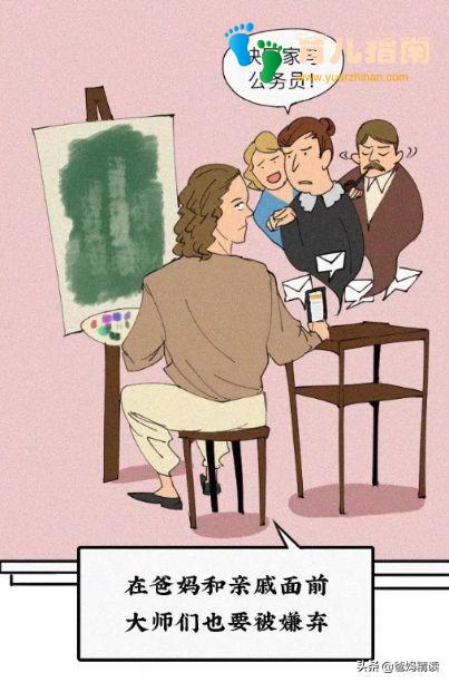 在这组漫画里大师们被嫌弃的理由很多,催婚、生子,而最多的是:在外画画也不挣钱,快回来考个公务员吧。