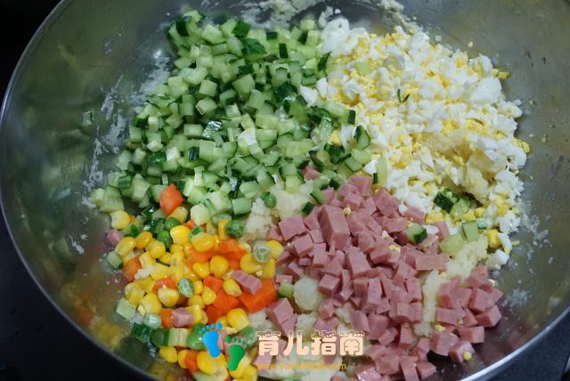 1.首先我们来制作土豆泥,正常大小的土豆两个,火腿肠丁50g,黄瓜丁50g,速冻五彩豆30g(胡萝卜丁,熟甜玉米粒,熟豌豆粒),煮熟的鸡蛋2个,盐两小勺,糖一小勺,胡椒粉一点点,牛奶50g,沙拉酱2汤匙。我们将土豆去皮蒸熟或者煮熟都行,碾碎。加调味品调成自己喜欢的口味,这个味道,大家根据自己的喜欢调味,不是必须和我给出的完全一样。
