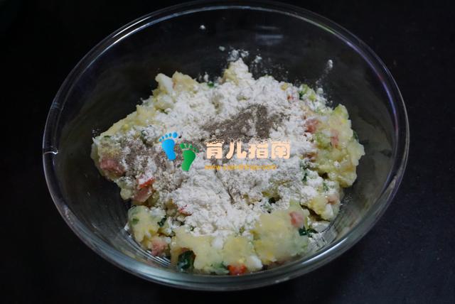 3.我们在土豆泥中加入面粉,和调味品抓匀,可以成型就可以了,太多的面粉容易发硬,如果太少也煎不成型。所以我们可以尝试看看,因为面粉的吸水性不一样,大家如果可以做成我图片中的圆饼即可。