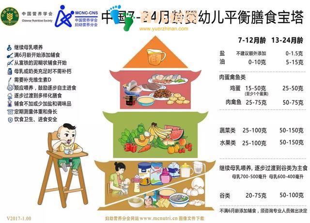 保证娃饮食均衡,营养全面,最简单的办法是按照中国营养学会推荐的婴幼儿膳食宝塔吃↓