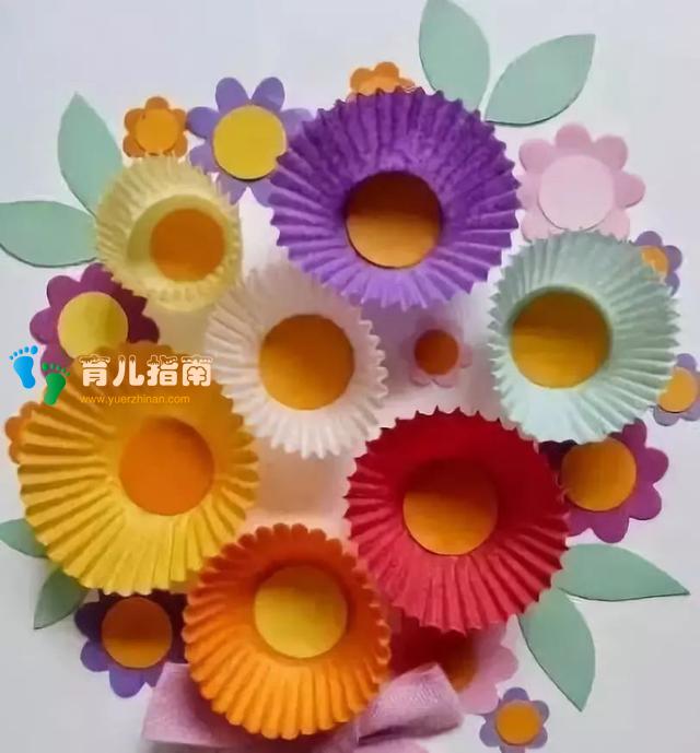 最后就粘贴蛋糕托,再贴一层圆形卡纸上蛋糕托上,漂亮的彩色花朵完成啦!