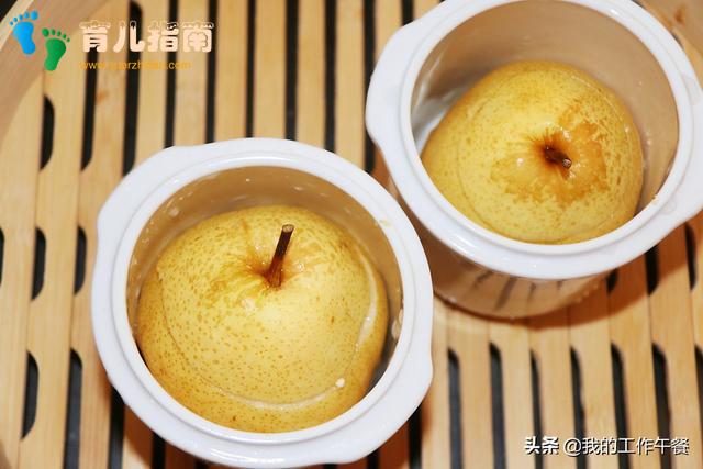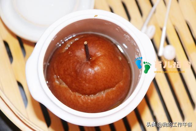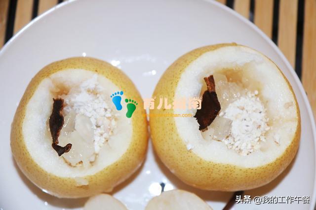 3、最后把切掉的雪梨尾重新放回雪梨上,再用牙签把雪梨尾固定住。蒸锅上汽后放入炖盅,盖上锅盖,小火加热1个小时,用筷子可以轻松扎透雪梨即可