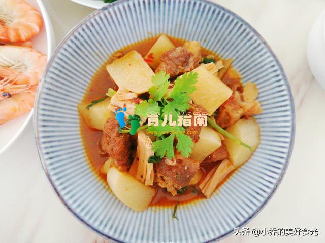 萝卜腐竹焖牛腩牛腩是网购的,1KG牛腩整了点优惠券花了76块钱,因为只有两个人吃,我只用掉了一半500克左右,所以牛腩成本38元,加上萝卜,腐竹,这道菜成本约40元左右。牛腩最费时间,要最先做。
