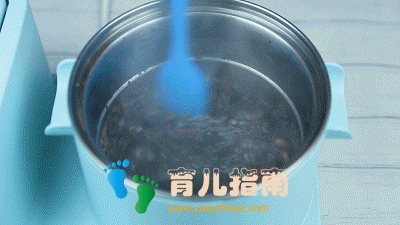 ▲步骤五:紫米粥煮开后,用勺子搅拌搅拌,然后转中小火继续熬煮,煮至粥米粘稠,食材熟透
