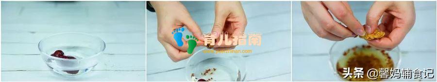 ▲步骤一:将准备好的红枣洗净,放开水中浸泡一会,然后去皮去核,备用