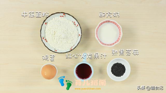 1、准备食材:熟黑芝麻2克,中筋面粉50克,配方奶40毫升,鸡蛋1个(约50克),红心火龙果汁15毫升。
