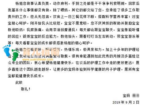 杨姐您做事认真负责,动作麻利,手到之处都是干干净净利索明朗。回家后我基本什么事情都没有做,除了喂奶,其它的都交给了您,您承担了很多工作职责外的工作,但从无怨言。