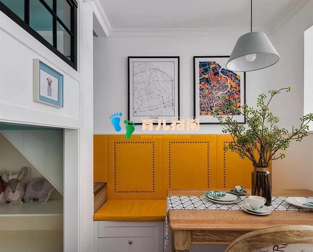 ▲靠墙做了简单卡座,美式复古餐桌椅搭配。橘色硬包靠背撞色。餐厅与客厅半墙设计,既做到了区域区分,又让光线互通不显压抑。卡座与小楼梯一体设计,可以上到隔层的活动区,隔层下方储物间,可以放置儿童玩具或者杂物方便又实用。