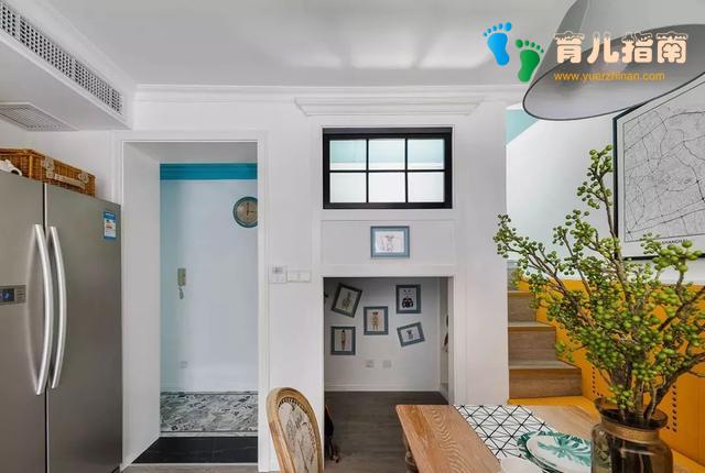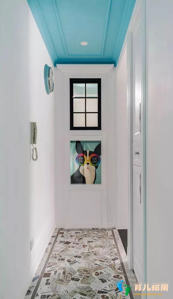 ▲玄关处地面用复古仿报纸的瓷砖铺贴,很是个性,惊艳到我了。对面墙做了简单线条造型,时尚挂画简单装饰,右手边内嵌鞋柜增加了储存空间。原始过道太长,所以牺牲一部分做了儿童房的活动区域,这是个特别之处。