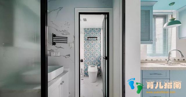 ▲厨房隔壁的卫生间干湿分离,洗手台外置,方便使用,湿区马桶花砖背景很是北欧范。