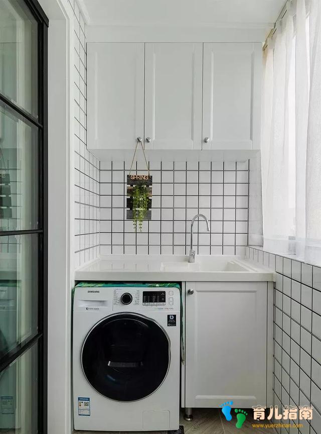 ▲黑色质感拼格玻璃门分割,北欧白格子瓷砖清新铺贴,洗手池镶嵌洗衣机,白色纱帘、清爽文艺。