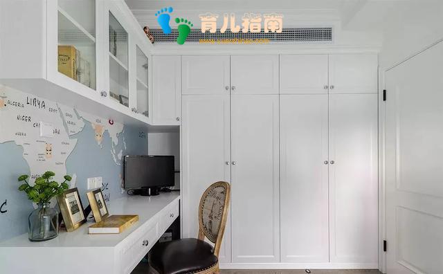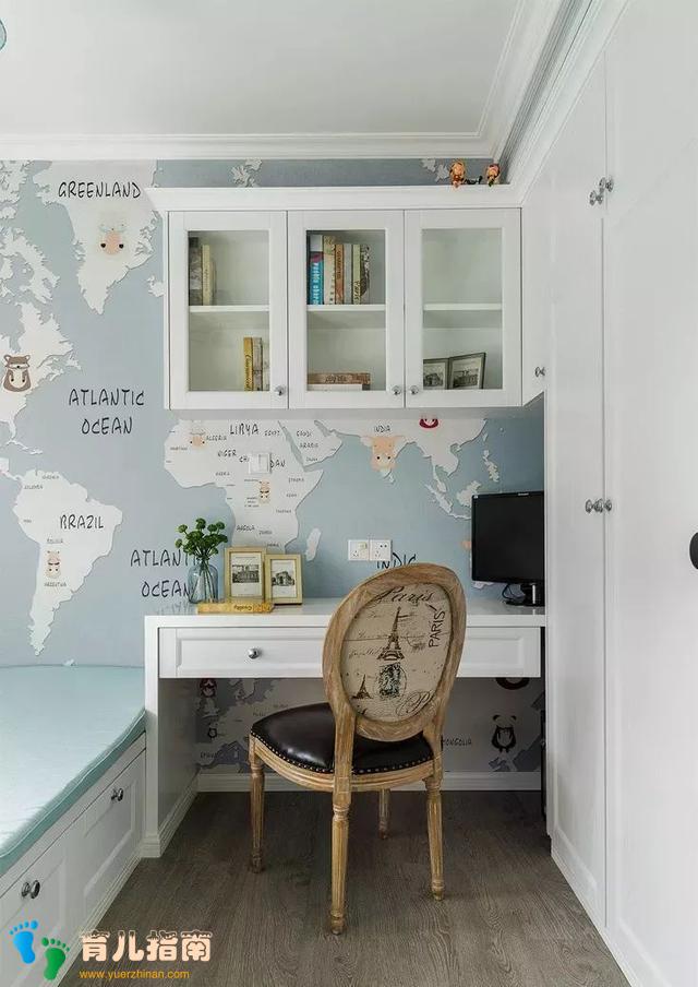 ▲通顶衣柜与书桌连体设计,大面积白色简洁素雅,榻榻米床开窗定制。背景蓝底地图壁布装饰,复古座椅突出美式元素清爽舒适,自然的空间不管学习还是睡觉安静舒适。