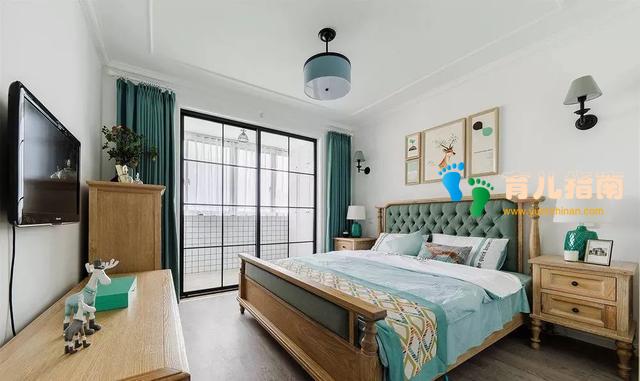 ▲白色的基础下,简单石膏线条勾勒,美式浅色复古家具搭配,蓝色窗帘和床品清新呼应,营造了一个舒适安静的睡眠空间。