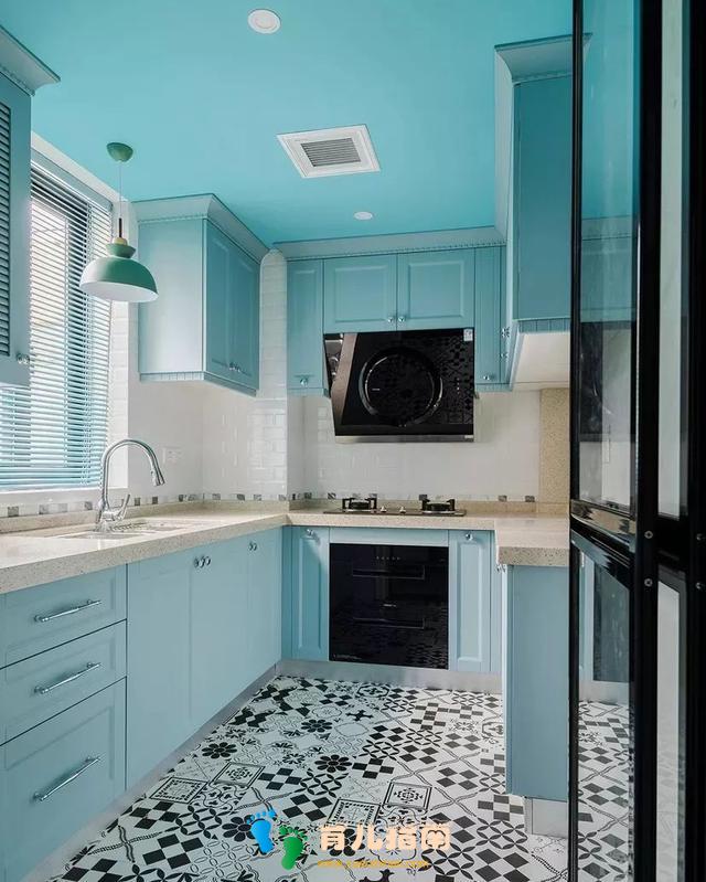 ▲蓝色的橱柜以及顶面蓝色喷涂,清新惊艳有点地中海的清爽。花色地砖中和了大面积蓝色带来的腻感,部分家电内嵌让厨房更加干净不杂乱。