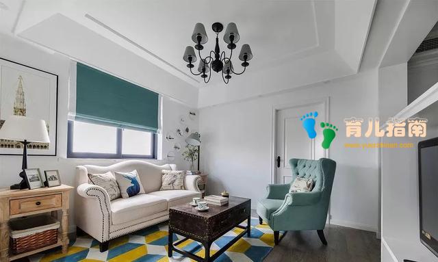 ▲因为有大梁,所以吊顶四周做了斜面处理,美式布艺沙发搭配复古茶几、边柜,蓝色单椅和窗帘清爽又不失沉稳。半截墙在这边的用途是,电视内嵌其中,既实用又美观。