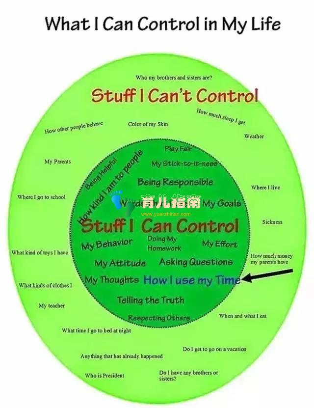 这是老师给孩子讲解的图表啦,其中蓝色的字体——怎么使用我的时间”,在中间的圆,属于我们可以控制的部分哦。