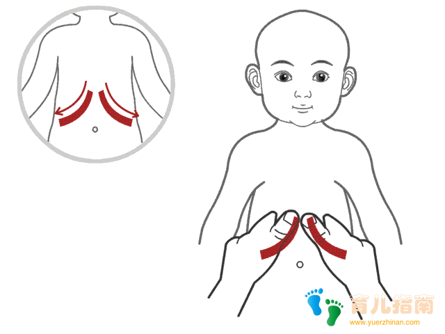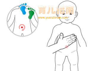 操作:用掌心顺时针推拿孩子腹部,5分钟。