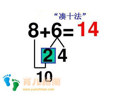 什么是凑十法?举个例子来说,8+6,把6拆分为2和4,得出8+2+4=14的结果。