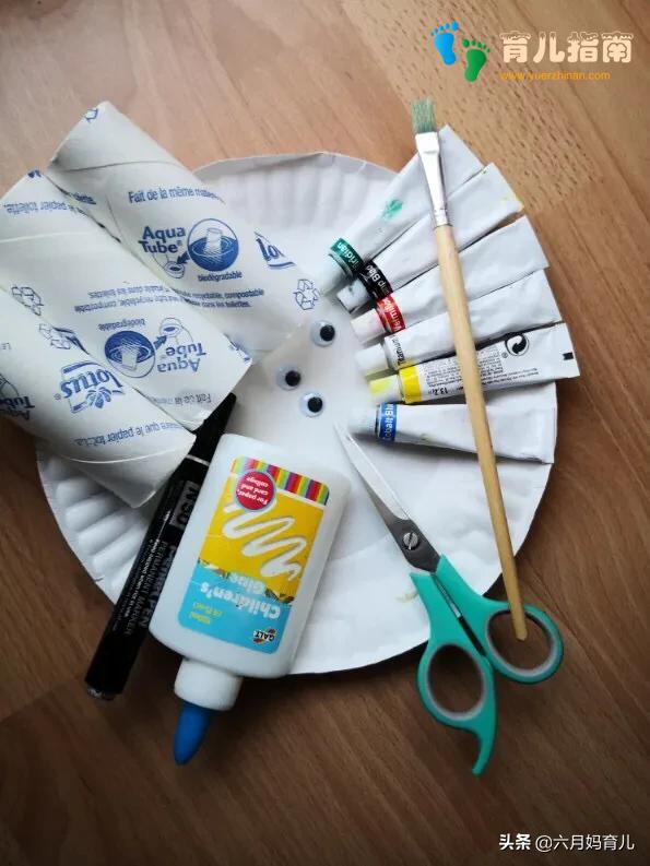 所需工具和材料: 三个卫生纸筒、剪刀、颜料(深色和浅色自行搭配)、颜料刷、塑料手工眼睛三只、胶水、马克笔。