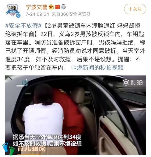 前不久新闻上一位义乌妈妈由于自己的疏忽,把2岁男孩反锁车内。消防员准备破拆车窗时,竟然遭到男孩妈妈的拒绝,称已经找了开锁师傅。后经劝说才同意破拆。当天室外温度高达34度,如果不及时救援,后果不堪设想。