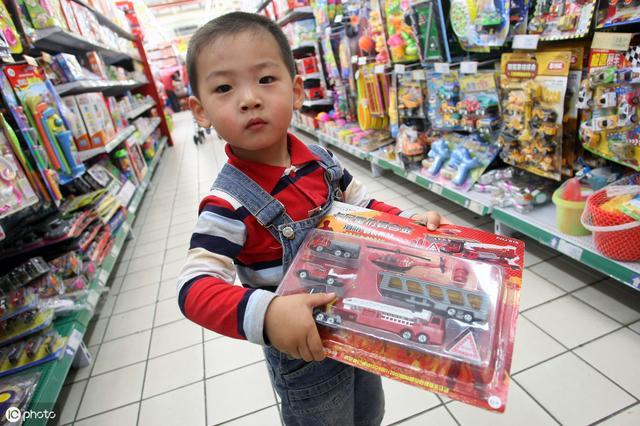 到了超市,月月在玩具枪的区域认真的看,堂姐则在玩偶和布娃娃处看。