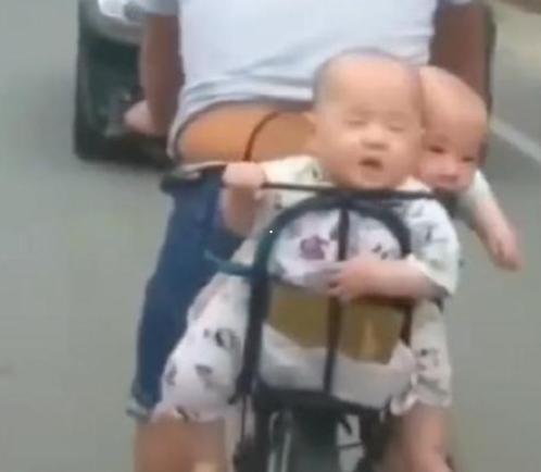 双胞胎坐在爸爸自行车座后,愉快地打起了瞌睡