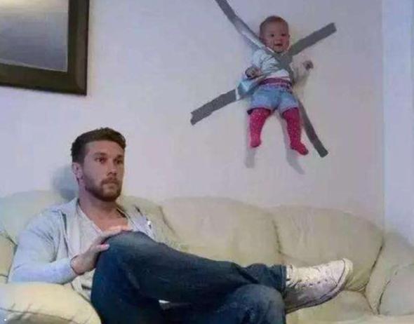 这位外国爸爸,为了能安安静静地看电视,防止孩子乱跑吵闹,竟用胶带将孩子贴在了墙上,显然这宝宝并不是第一次被爸爸这么对待了,完全不哭不闹,看起来似乎还很开心。