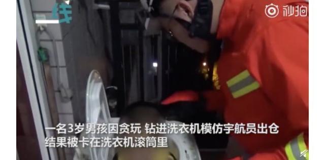 重庆一名3岁男孩因贪玩钻进洗衣机,模仿宇航员出舱,结果被卡在洗衣机的滚筒里,妈妈急的赶紧报警求助。幸好消防救援人员及时赶到,才将孩子安全救出。