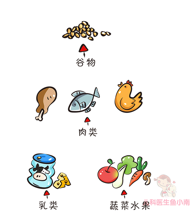说完盐的话题,回到食物本身上。1岁多的宝宝,需要4大类食物: