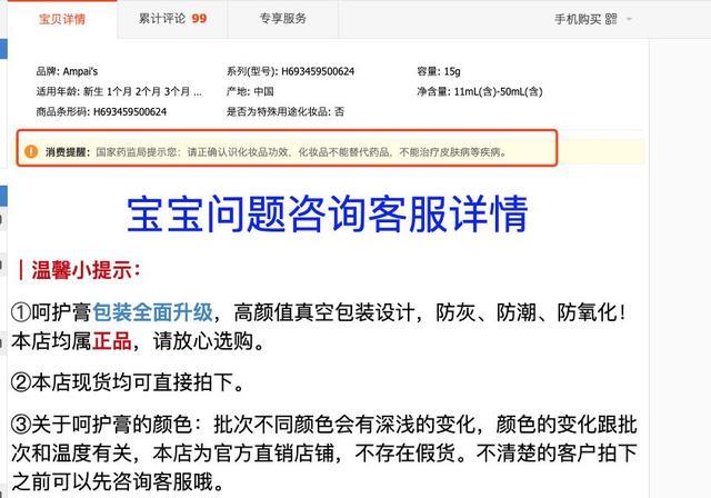 嘟妈查了半天,都没有查到该产品的生产企业,只看到了某宝上面的提示,化妆品不能代替药品,不能治疗皮肤病等疾病。