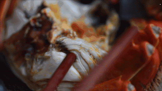 吃完蟹盖轮到蟹身,先用剪刀将多余的蟹腮剪掉;