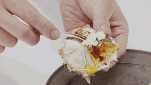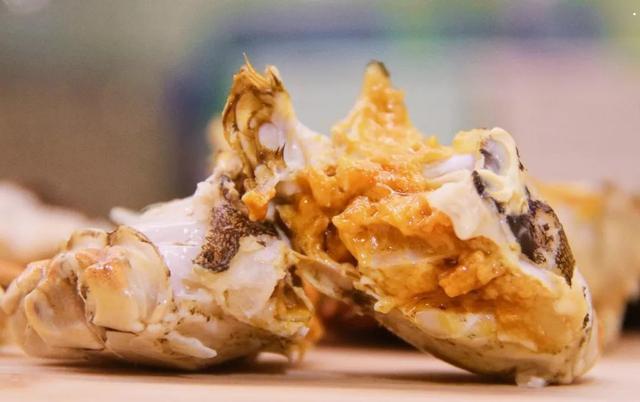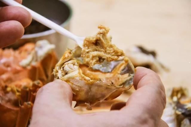 先吃蟹盖部分,用小勺把中间的蟹胃部分舀出,轻轻将外面包裹着的蟹黄吮干净。注意,不要吮破中间那个呈三角锥形的蟹胃,那个要丢掉;