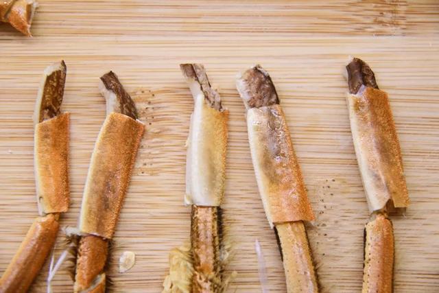 用剪刀把蟹腿剪成三截,最末一节蟹脚尖可充当工具,先用蟹脚尖细的那一头把蟹腿中段的肉捅出来,再用蟹脚尖粗的那一头把蟹腿前段的肉捅出来;