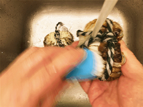 烧水期间,可以洗刷螃蟹——用刷子将螃蟹身上的肉眼可见的污渍刷干净,边刷边冲,一只螃蟹冲刷30秒左右即可。
