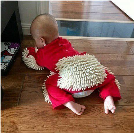 《太阳报》报道的婴儿爬行服可以帮这些父母实现他们的梦想”。这种连体爬行服的前部、后面及手臂处都有条状拖把”纤维。该爬行服的产品介绍中说,让你的宝宝帮忙打扫房间吧!”生产商称衣服上的纤维对宝宝的爬行能起到额外的保护作用。